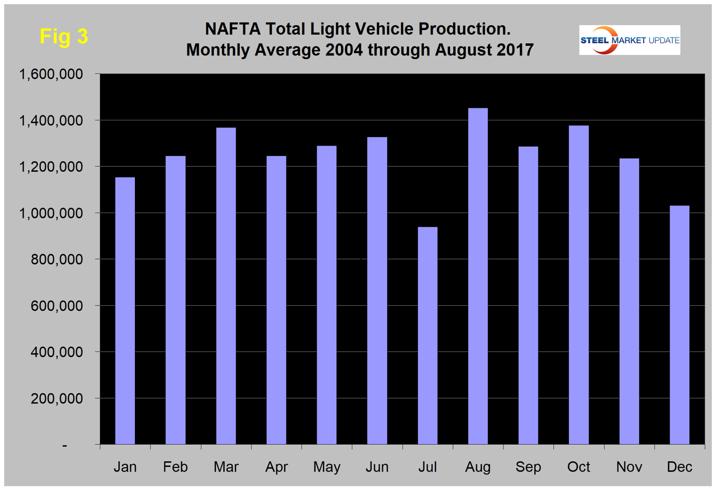 NAFTA Vehicle Assemblies: Total light vehicle production in NAFTA in August hit an annual rate of 18.407 million units, up from 12.694 million in July, which was when the re-tooling outages occurred. On average since 2004, August’s production has been up by 54.6 percent from July. This year production was up by 45 percent, therefore weaker than normal (Figure 3). This was the fourth straight month in which production was lower than expected from historical projections. Year to date through August, production was down by 13.9 percent from the same period in 2016.