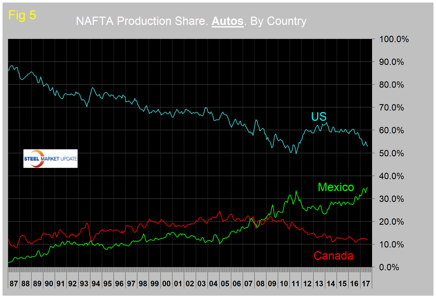 This means the shift south of the border is accelerating. This shift is most pronounced for autos as shown in Figure 5. The U.S. now has a market share of autos of 52.8 percent, Mexico has 35.0 percent and Canada has 12.2 percent.