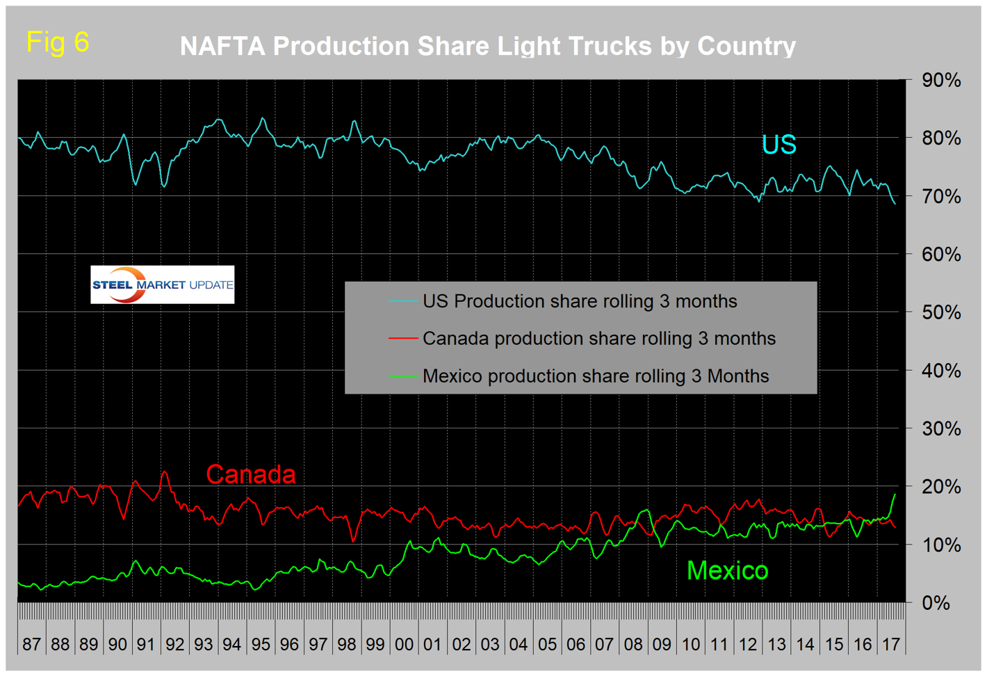 The Mexican share of light truck assemblies in NAFTA is expanding rapidly at the expense of the United States.