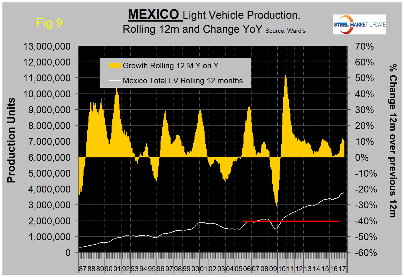 Figures 7, 8 and 9 show total light vehicle production by country. The brown bars are the respective growth rates and they tell the whole story. The red line on each chart shows the change in production since Q2 2006. Note the scales are the same to give true comparability and that Mexican growth has surged in 2017.