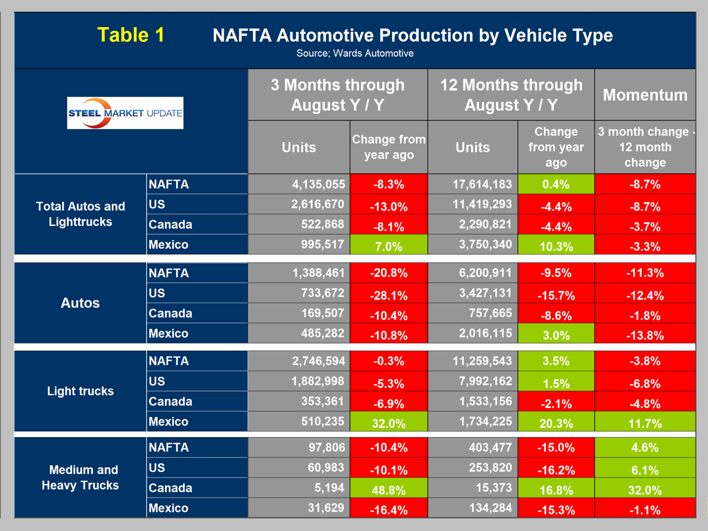 Like a broken record, we repeat here what we have been reporting for a while—from the U.S. point of view the news is not good. It now seems irrefutable that we are in the midst of a huge shift in assembly volume of both autos and light trucks from the U.S. to Mexico with Canada on the sideline. On a rolling 12-months basis year over year, total light vehicle production in the U.S. declined by 4.4 percent. Canada also declined by 4.4 percent, but Mexico increased by 10.3 percent. The comparison is worse for the U.S. comparing the latest three months year over year when the results show the U.S. down by 13.0 percent, Canada down by 8.1 percent and Mexico up by 7.0 percent (Table 1).