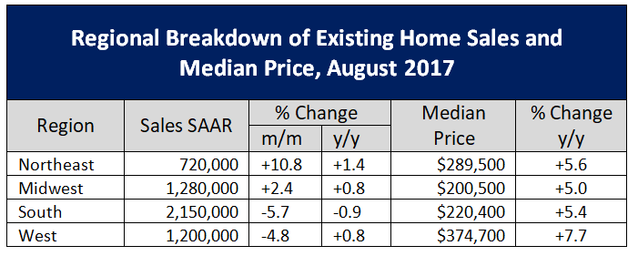 Median price for all housing types rose 5.6 percent year over year to $253,500. Inventory at the end of August stood at 1.88 million existing homes for sale, down 2.1 percent from July and 6.5 percent below the year-ago total of 2.01 million. At the present sales rate, unsold inventory is at a 4.2-month supply, down from 4.5 months in August 2016.