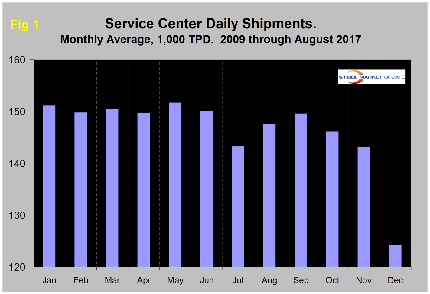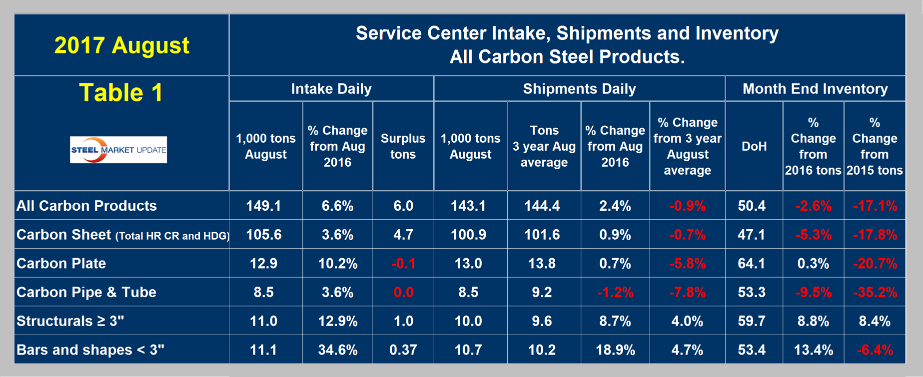 Daily shipments in August were 1.8 percent higher than in July. On average since 2009, August has increased by 3.0 percent, therefore the latest numbers were less than the historical average for this time of year. Carbon steel shipments were 143,100 tons per day in August and days on hand on the 31st averaged 50.4, almost the same as the 50.3 at the end of July.