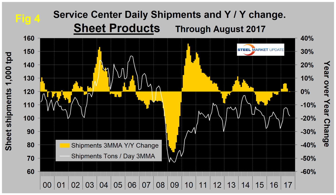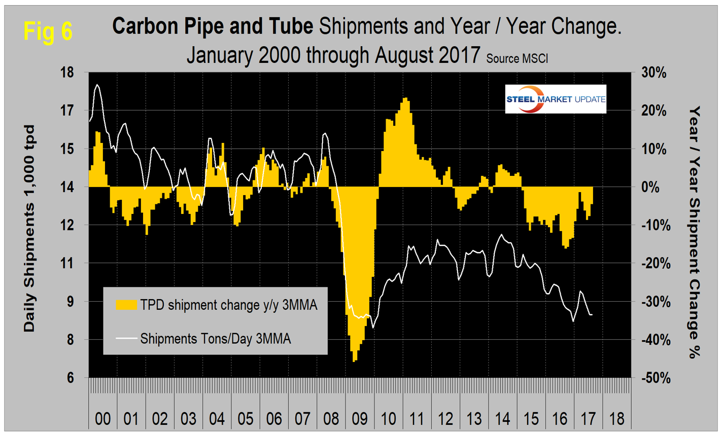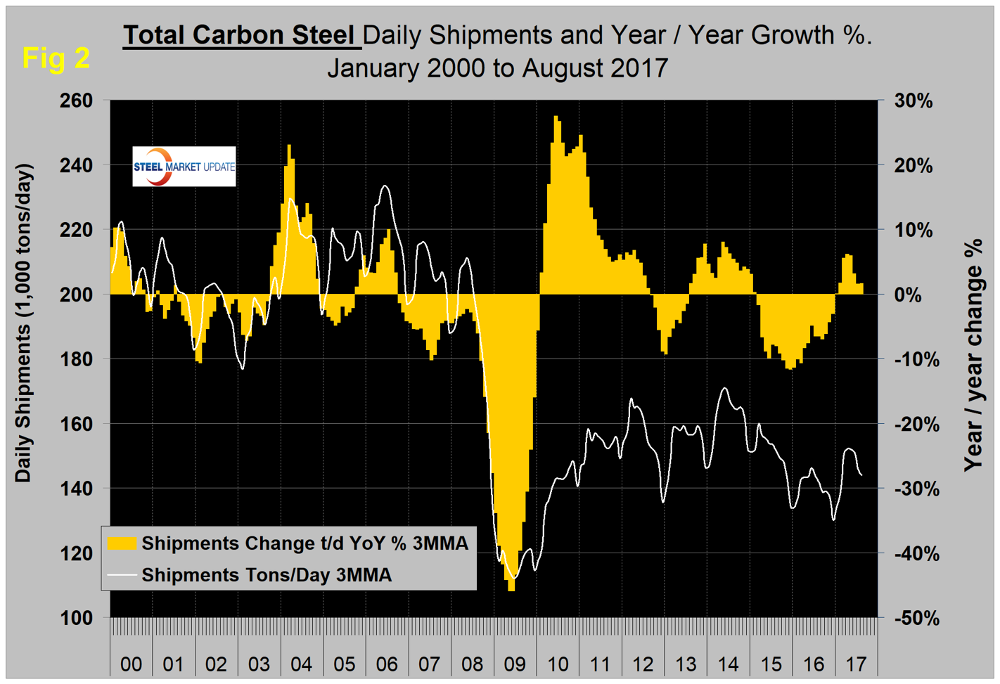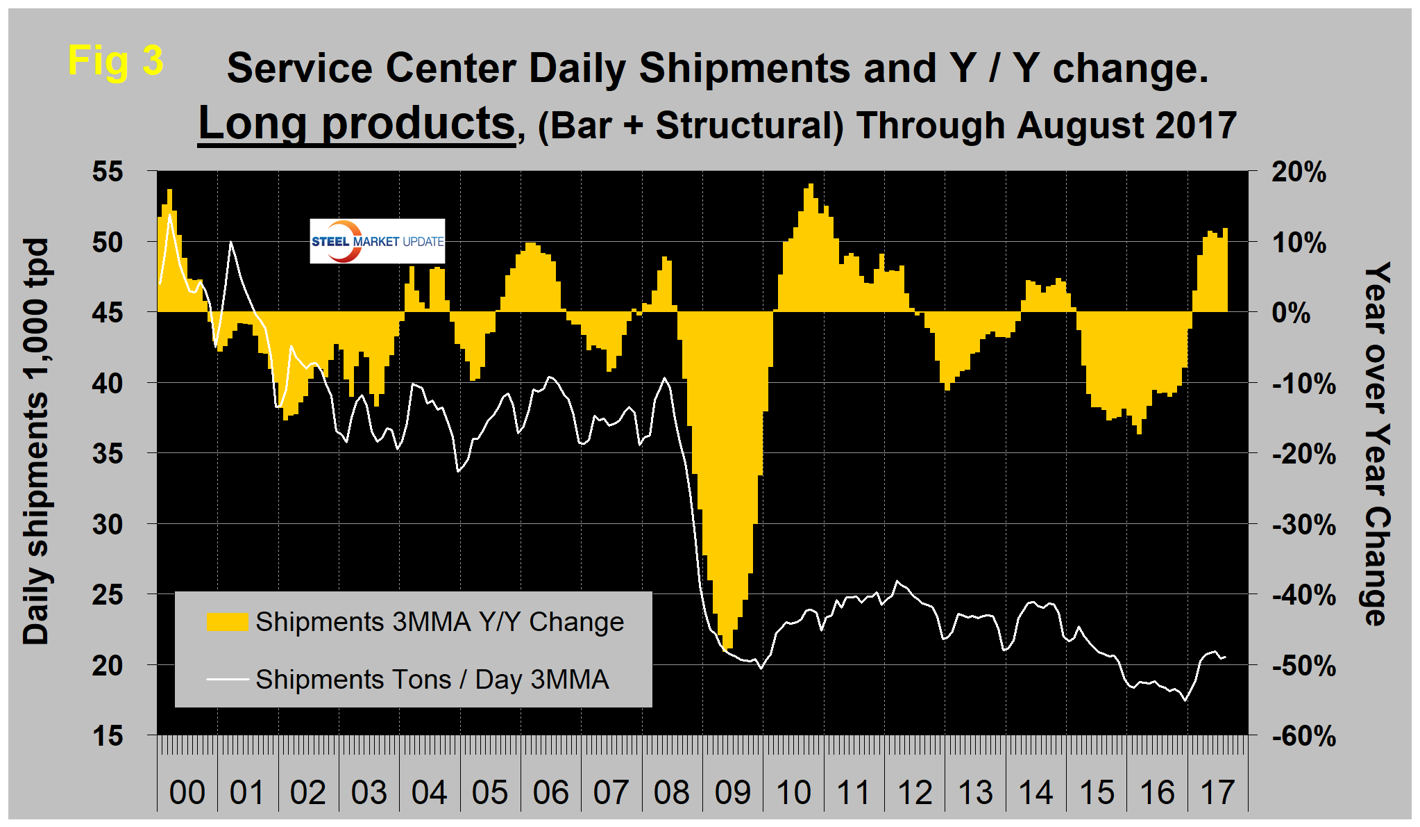 Shipments of all products except tubulars were up from August last year. Figure 2 shows the long-term trend of daily carbon steel shipments since 2000 as three-month moving averages.