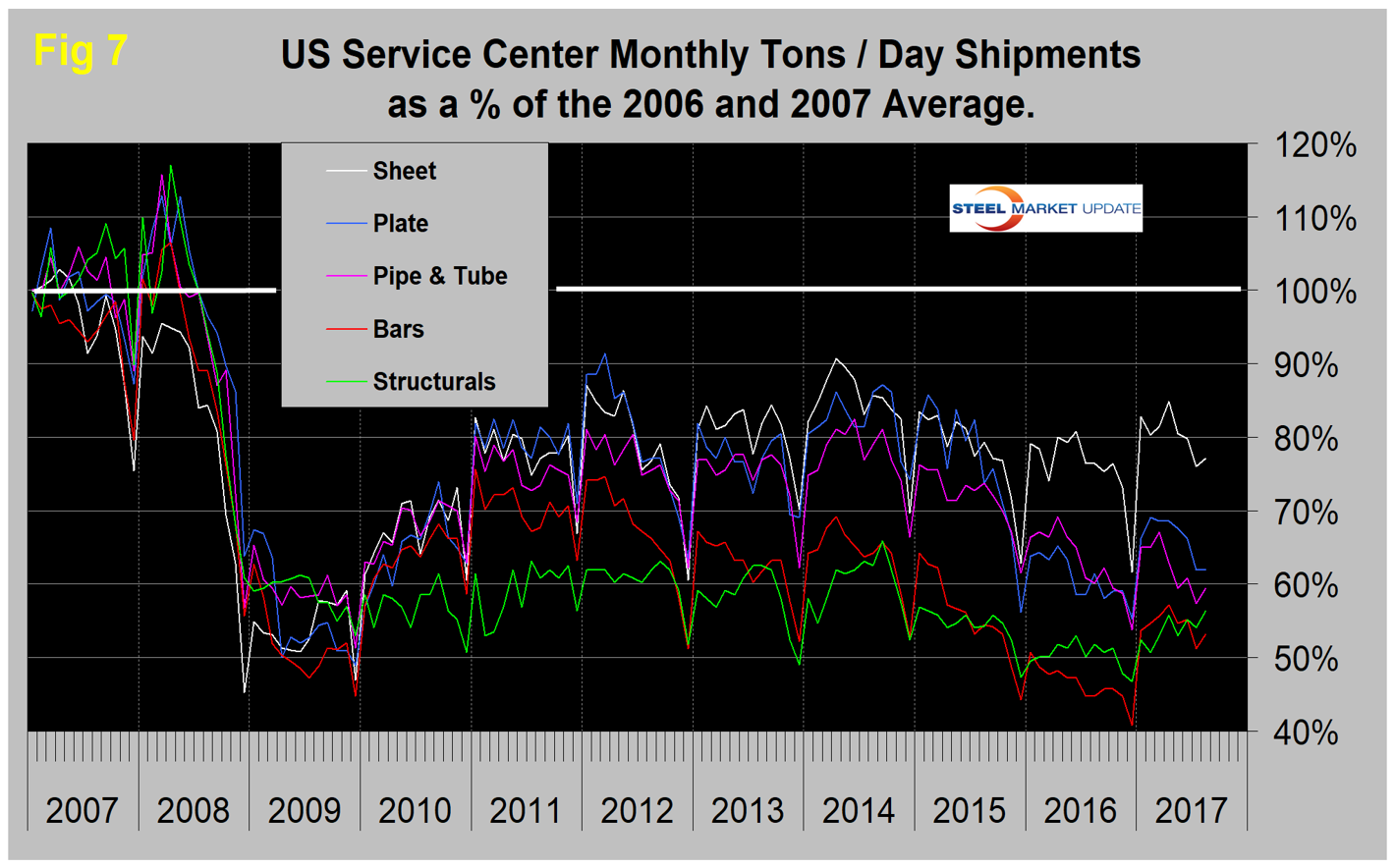 In 2006 and 2007, the mills and service centers were operating at maximum capacity. Figure 7 takes the monthly shipments by product and indexes them to the average for 2006 and 2007 to measure the extent to which shipments of each product have recovered. Each year, all products experience the December collapse and January pickup. In August, the total of carbon steel products was 67.4 percent of the shipping rate that existed in 2006 and 2007. Structurals and bar were 56.3 percent and 53.2 percent, respectively. Sheet was at 77.1 percent, plate at 61.9 percent and tubulars at 59.4 percent.