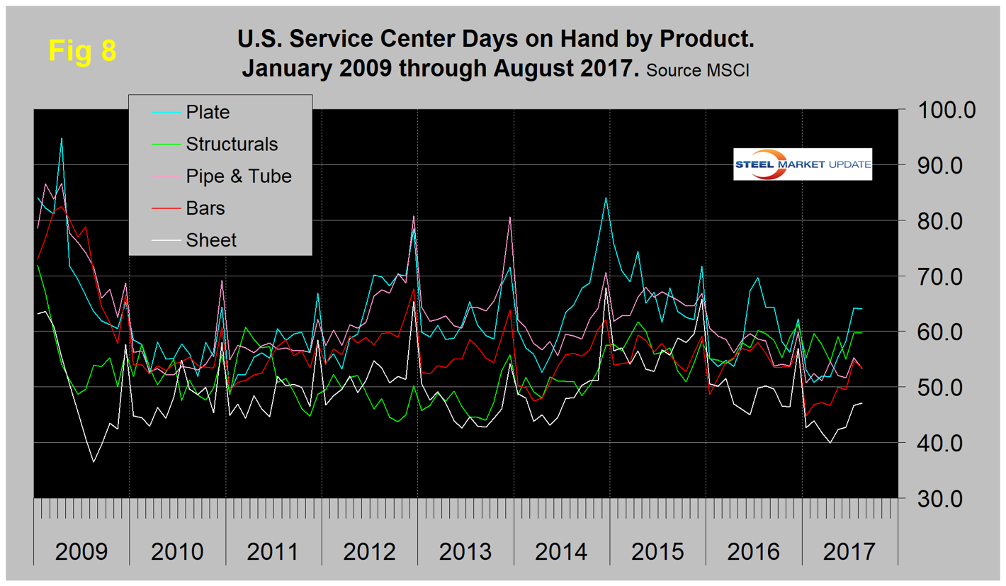 March closed with months on hand (MoH) of 1.94 for all carbon steel products, which was the lowest level in 13 years (since August 2004). This anomaly partly resulted from 23 shipping days, which was the same as August. We have now removed that effect as described above. Compared to the end of August last year, days on hand (DoH) declined from 53.0 to 50.4, but there has been an increasing trend for all products in the last five months. On a tonnage basis, total carbon steel inventories at the end of August were down by 2.6 percent y/y, led by pipe and tube, which declined by 9.5 percent. Sheet was down by 5.3 percent and plate was up by 0.3 percent. Bar-sized shapes were up by 13.4 percent. Figure 8 shows the DoH by product monthly since August 2009.