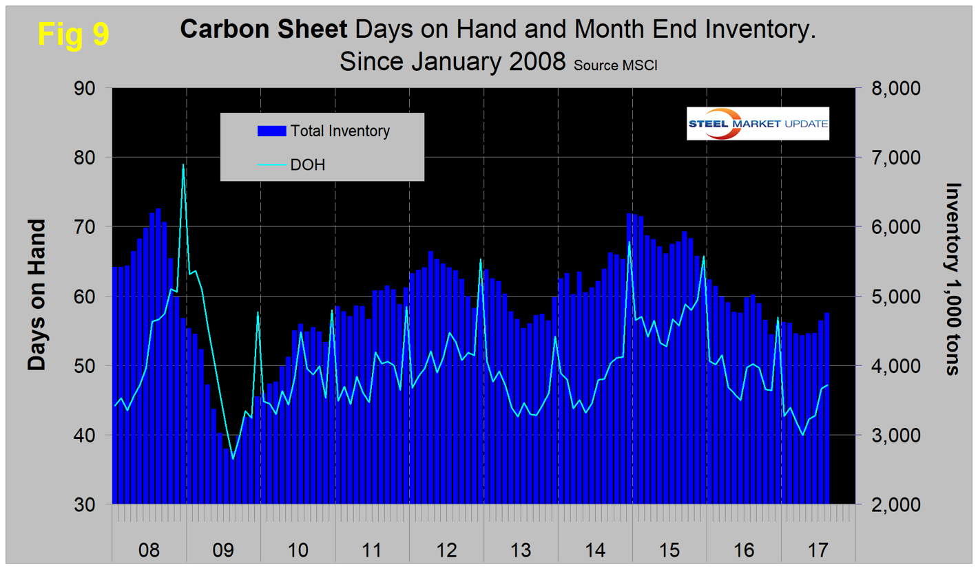 Figure 9 shows both the month-end inventory and days on hand since August 2008 for total sheet products. The total inventory tonnage of sheet products has been in decline since the end of 2014 with a possible turnaround beginning in July and August.
