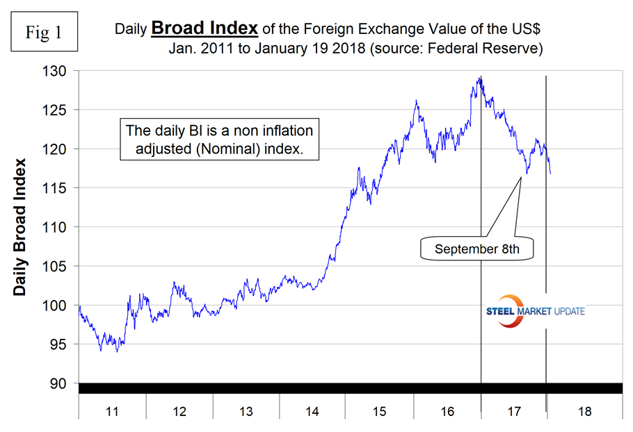 The value of the U.S. dollar on the international exchange markets has been in freefall since Dec. 12, according to Steel Market Update’s latest analysis of currencies. From Jan. 3 through Sept. 8, 2017, the Broad Index value of the U.S. dollar depreciated by 9.3 percent. The value rebounded by 2.97 percent from Sept. 9 through Dec. 12, but has since fallen back to the Sept. 9 low.