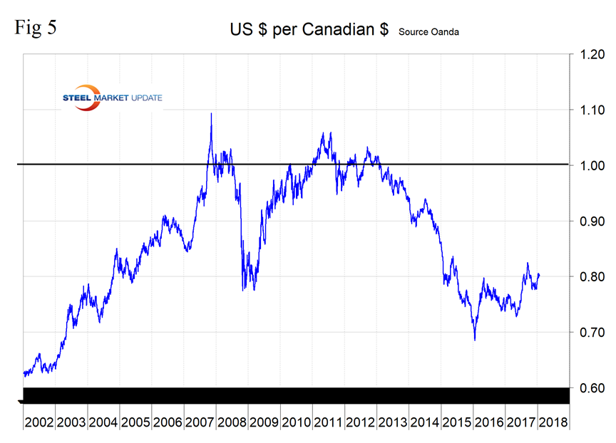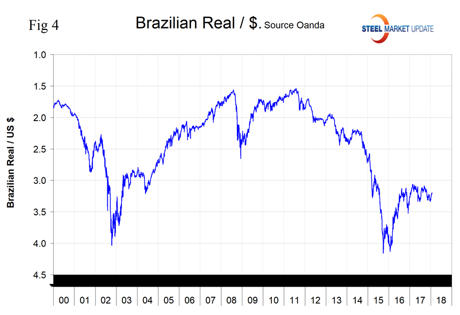 Brazil’s real has been treading water for two and a half years and in the last three months has strengthened by 0.3 percent (Figure 4). It now takes 3.197 real to buy one dollar. In 2017, the U.S. imported 37.4 million metric tons of steel products and semis. Brazil was the second highest volume source, supplying 4.7 million metric tons or 13.5 percent.