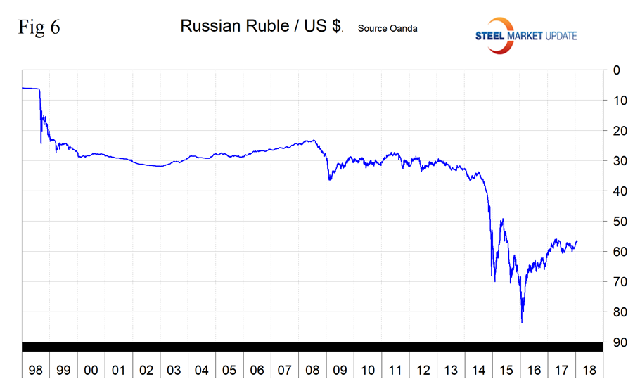 Russia’s ruble strengthened by 1.6 percent against the dollar in the last three months and it now takes 56.56 rubles to buy one dollar (Figure 6). Russia was the fifth highest volume importer of steel products to the U.S. in 2017 with a total of 2.85 million metric tons or 8.2 percent of the total.
