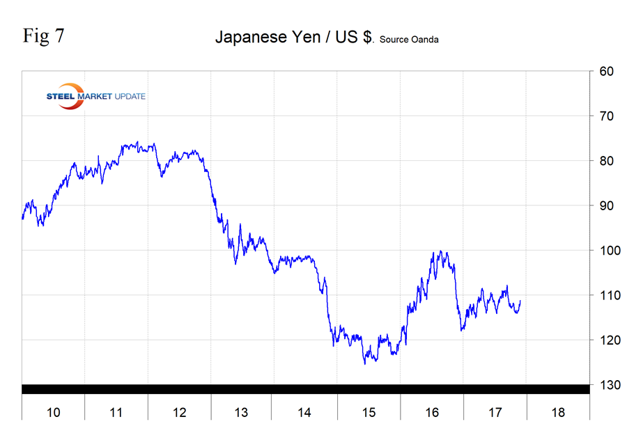 Japan’s yen has appreciated by 2.4 percent in the last three months and one dollar is now worth 110.8 yen (Figure 7). Japan shipped 1.8 million metric tons of steel products to the U.S. in 2017, which was 5.1 percent of the total. On Jan. 23, Wall Street Breakfast had this to say: “Keeping monetary settings unchanged overnight, Japan’s central bank said it would maintain its massive stimulus program, lagging behind global peers in normalizing policy. The BOJ also announced that ‘inflation expectations have moved sideways recently,’ versus a previous assessment that they were weakening, though risks to prices remain ‘skewed to the downside.’”