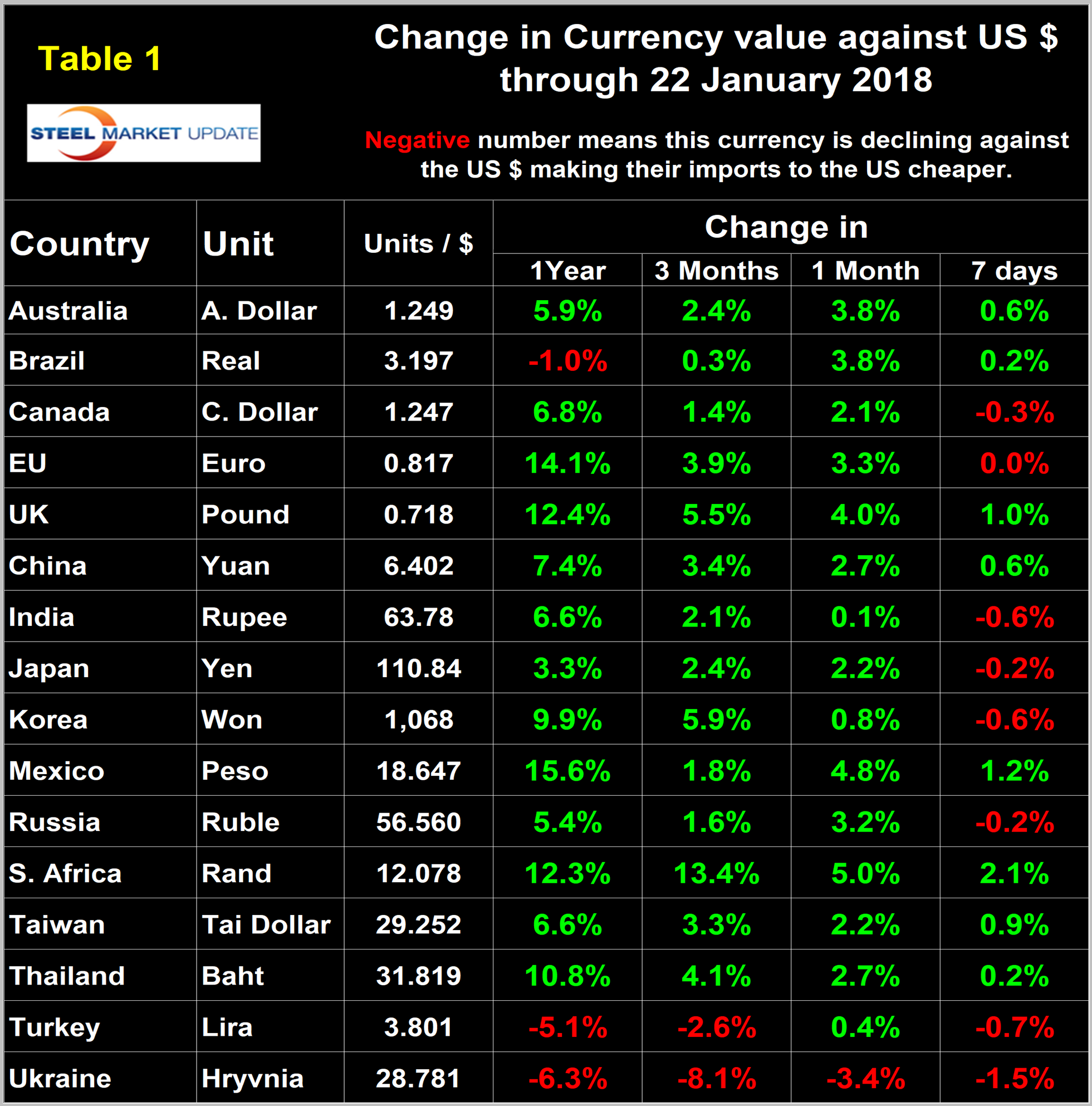 Each month, SMU publishes an update of Table 1, which shows the value of the U.S. dollar against the currencies of 16 major global steel and iron ore trading nations. The table shows the change in value in one year, three months, one month and seven days through Jan. 22. Figure 2 gives a longer-range perspective and shows the extreme gyrations that have occurred in the last three years. Figure 2 shows that the dollar weakened against 15 of the 16 in the last month and against 14 of the 16 in the last three months. Quite often the change in value of these 16 currencies does not accord with the broad index, but this is not one of those times.