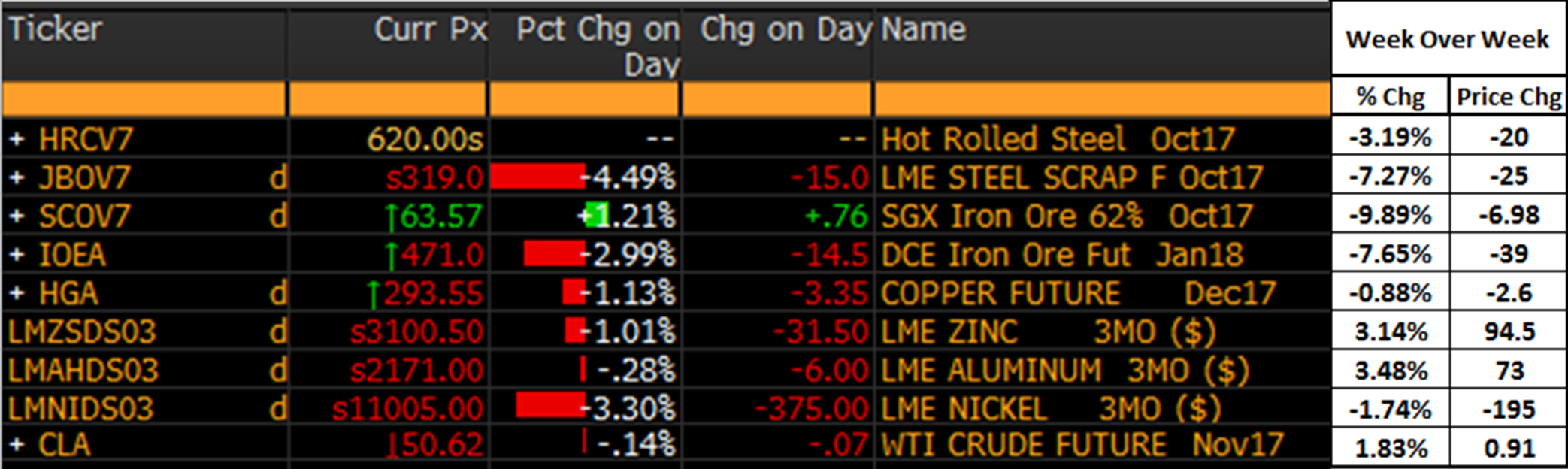 Ugly week out there folks. Since last Thursday, the October SGX iron ore future is down almost 10 percent and the October LME Turkish scrap future is down 7.3 percent. In the table below are today’s prices, and the weekly change is to the right of each product. Today, 5,000 tons of October, November and December CME HRC futures traded at $605. The October CME HRC future trading $605 wasn’t reflected by Bloomberg, but the weekly price change of down 3.2 percent reflects the $605 level.