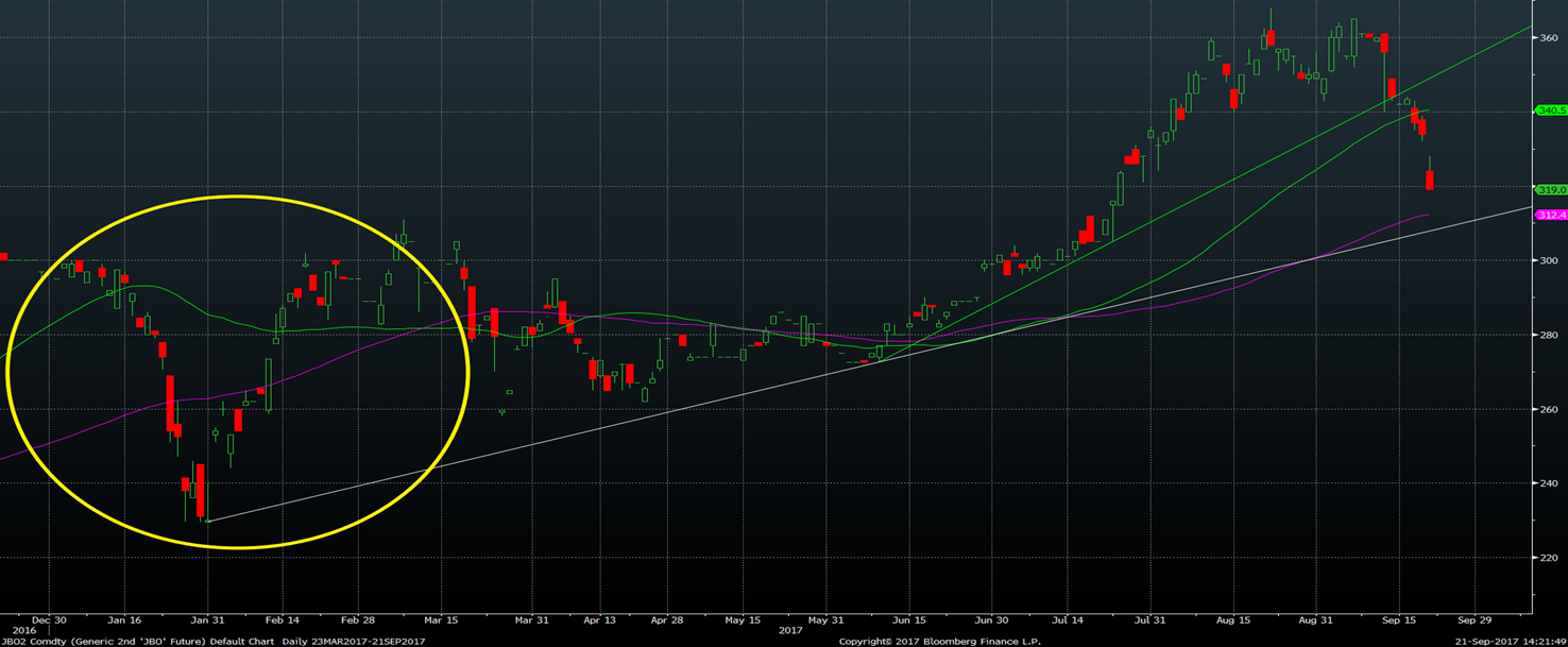 The October LME Scrap future has moved down $46 in two weeks! Turkish scrap saw a similar move that started in mid-January when prices ripped $70 lower in two weeks. However, two weeks after that, the price had a V-shaped recovery, rebounding right back to $300/t. There’s no doubt the falling scrap price will pressure HRC, but will it rebound as it did in January? Also, you have some support in there with the long-term up trendline, and a lot of times you see ceilings/resistance become floors/support.