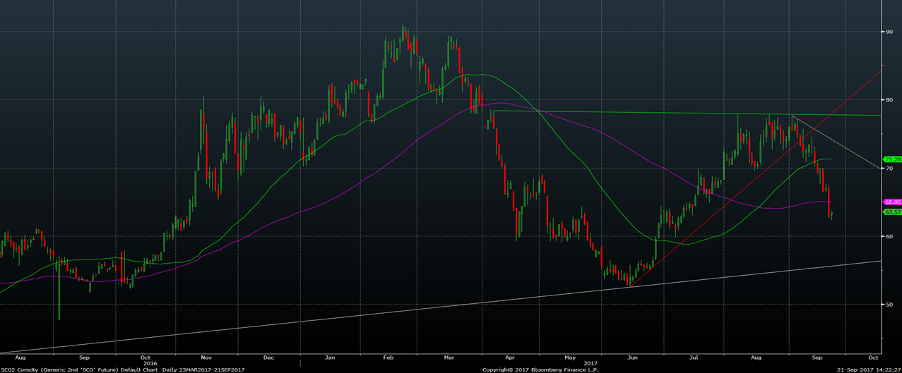 SGX iron ore futures are concerning. The price has fallen $6.5 or 10 percent in one week. It has blown through its short-term trendline and moving averages. Two key levels to watch would be the longer-term trendline around $56 and the June low at $53. If prices break the long-term trendline and the June low, then ore will have officially moved into a downtrend with lower highs and lower lows.