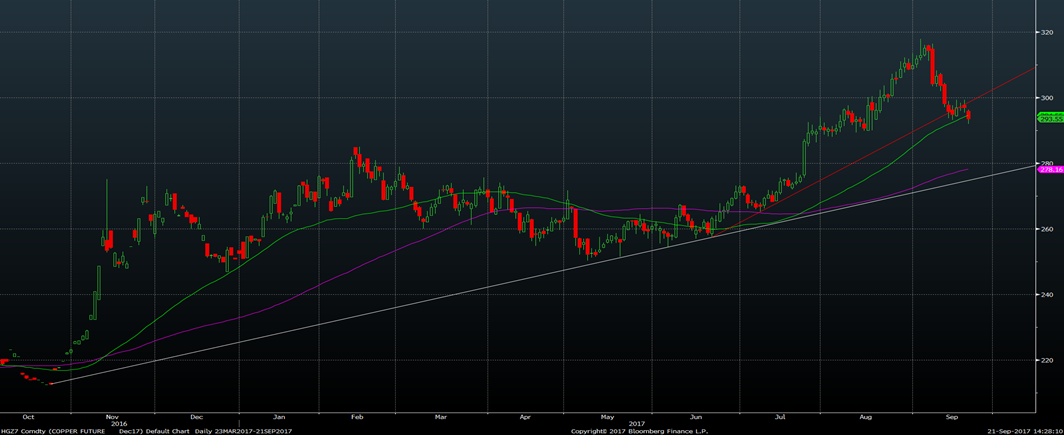 Collectively, while there seems to be some recent price pressure on the group, the long-term uptrends remain unbroken and fundamentals continue to be strong. Pay close attention to the ore and scrap story. However, one has to consider if HRC pricing could decouple considering the continued strength in U.S. manufacturing evidenced by the ISM, low inventory levels, falling imports and a demand boost resulting from the destruction caused by this year’s hurricanes.