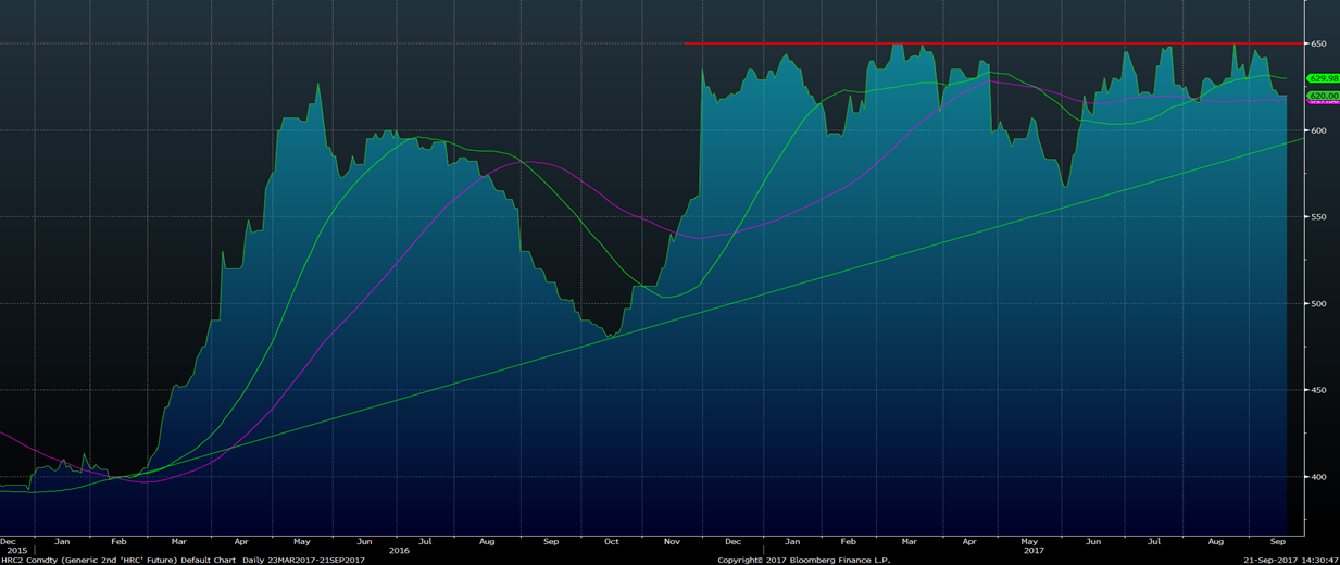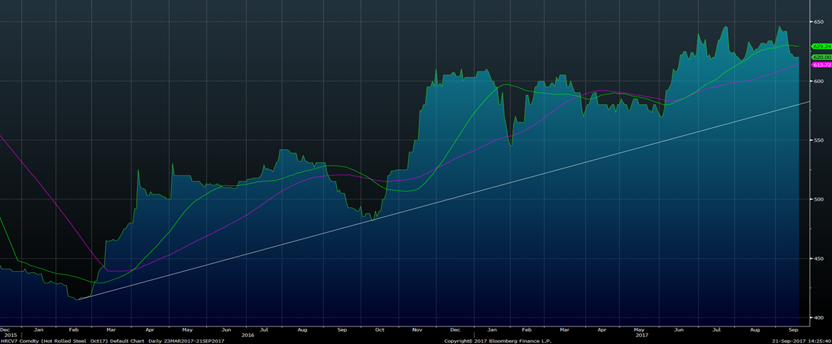 The chart of the October HRC future doesn’t reflect the $605 trade today. If it did, prices would have broken below both the 50- and 100-day moving average, but it would still be above the long-term trendline.