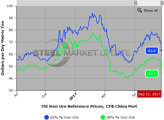 Spot iron ore pricing dropped 7.4 percent within the past 24 hours with 62% Fe iron ore fines hitting $63 per dry metric ton (dmt). Iron ore has dropped $15.80/dmt over the past month. On Aug. 22, 62% Fe fines were trading at $78.8/dmt, according to The Steel Index.