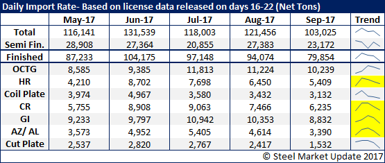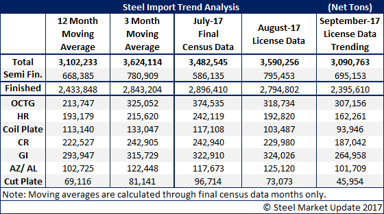 Earlier this month, foreign steel imports for September were trending toward a 2.6-million-ton month based on import licenses through the first 12 days of the month. Over the past week, the pace for import license requests has picked up. This is most likely due to the impact of the two hurricanes: Harvey in Texas and Irma in Florida. Based on the latest import license data, September is now trending toward a 3.0-million-ton month. The trend is modestly lower than our 12-month and 3-month moving averages. Yet, it is a bit of a disappointment as the steel industry is expecting foreign steel imports to drop dramatically due to the threat of the Section 232 investigation on steel from earlier this year. That threat has now been pushed out to maybe as late as 1Q next year.