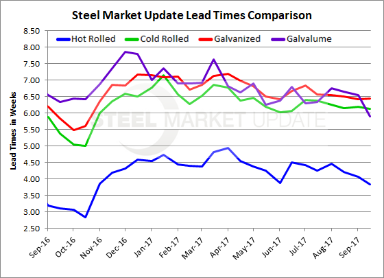 Flat rolled steel lead times have been relatively flat going back to early May 2017, according to the service centers and manufacturing companies who participated in the Steel Market Update (SMU) flat rolled market trends survey this week. Lead time, which is the amount of time it takes for the domestic steel mills to produce a new order from the time the order was placed, have been averaging close to four weeks for hot rolled, six weeks for cold rolled, six and a half weeks for galvanized, and Galvalume has been averaging six weeks.