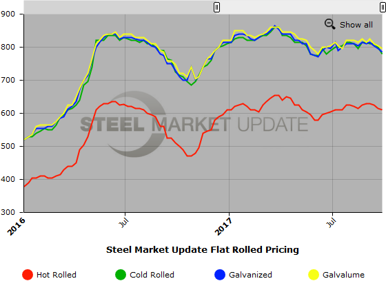 SMU Note: Below is a graphic showing our hot rolled, cold rolled, galvanized, and Galvalume price history. We will add plate prices to this graph once we have gathered a few months of data. To use the graph’s interactive capabilities, you must view it on our website here. If you need help navigating the website or need to know your login information, contact us at info@SteelMarketUpdate.com or by calling 800-432-3475.