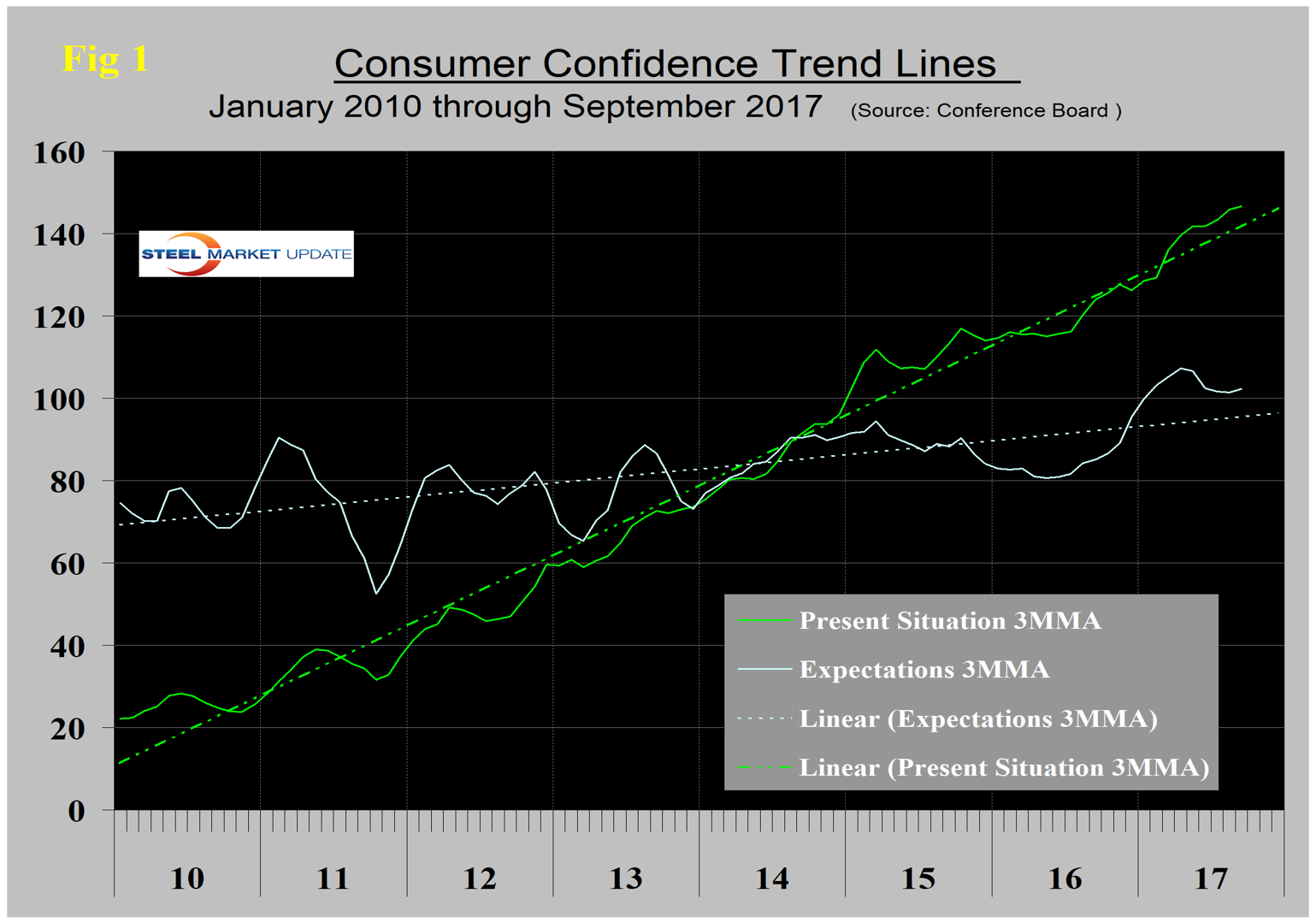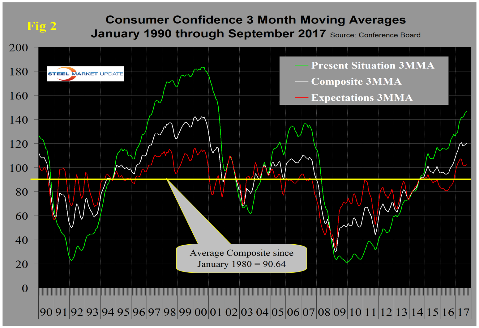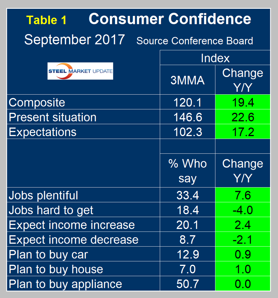 The composite value of consumer confidence in September was 119.8, down from 120.4 in August. The first estimate for August was revised down from 122.9. The last seven months have each been better than at any time since 2001. The three-month moving average (3MMA) increased from 119.2 in August to 120.1 in September, which was 19.4 points higher than in September last year. Consumers’ view of the present situation declined slightly in September. Consumer confidence is the driver of consumer spending, which is the largest component of GDP and which ultimately drives a large portion of steel consumption.