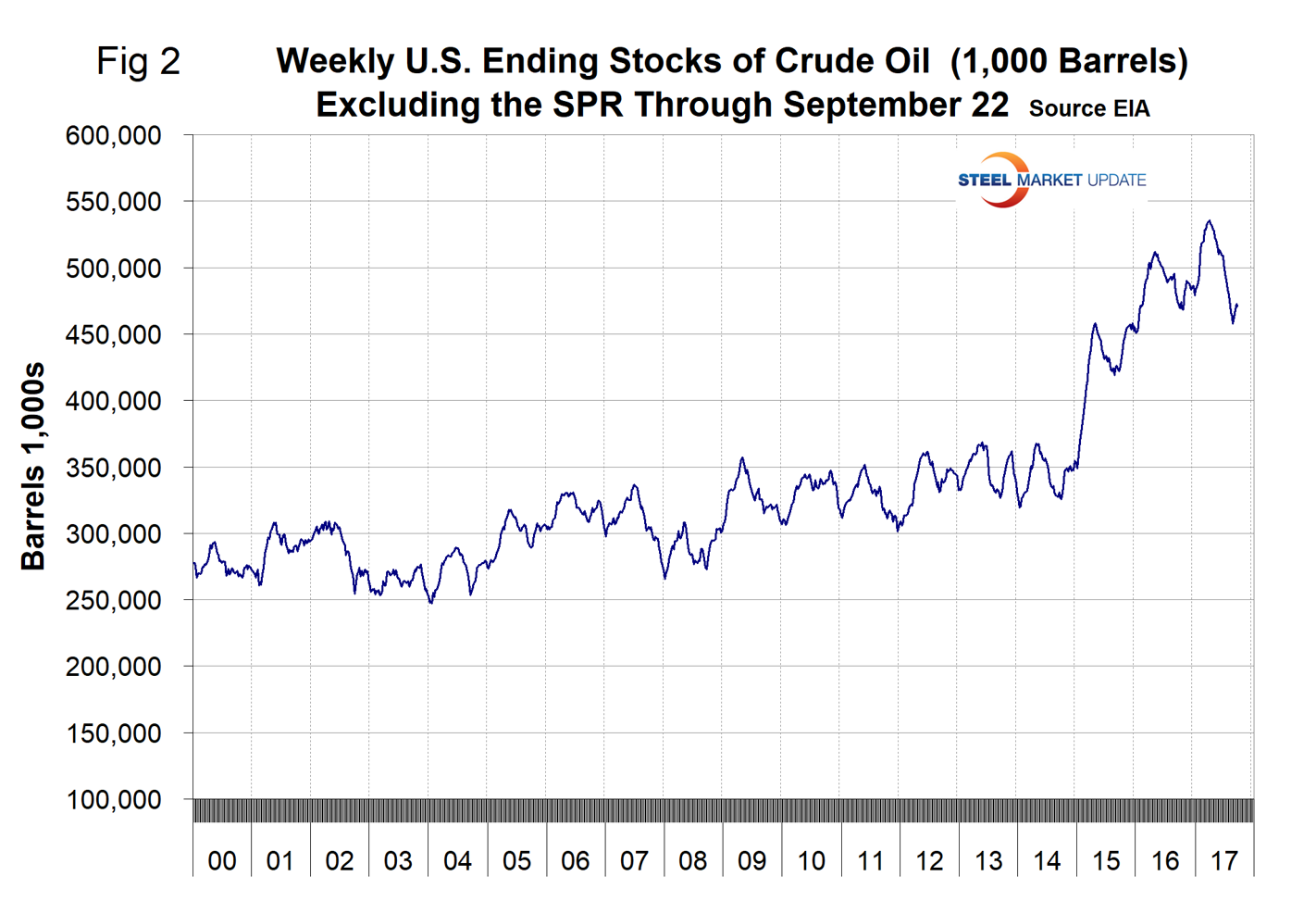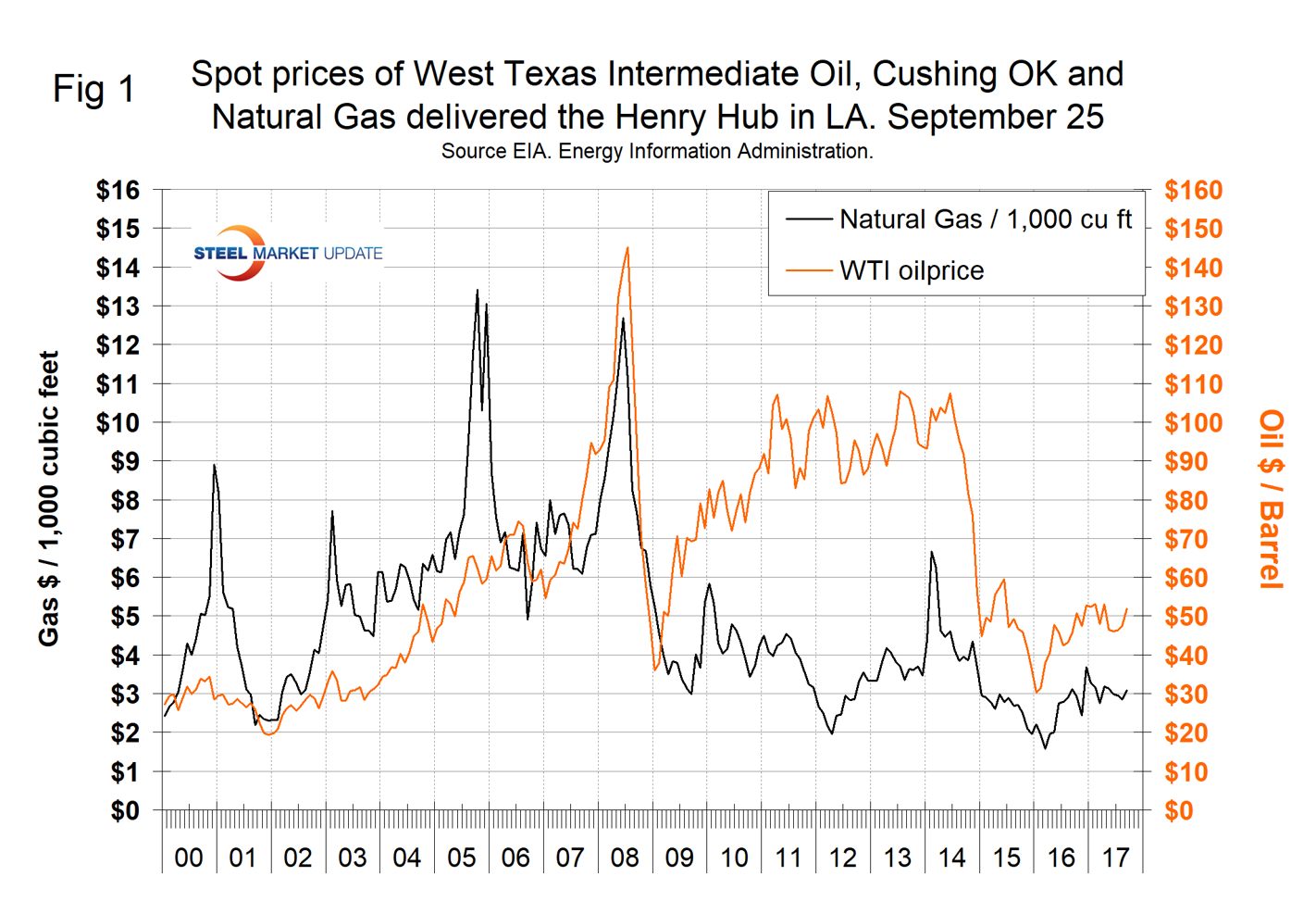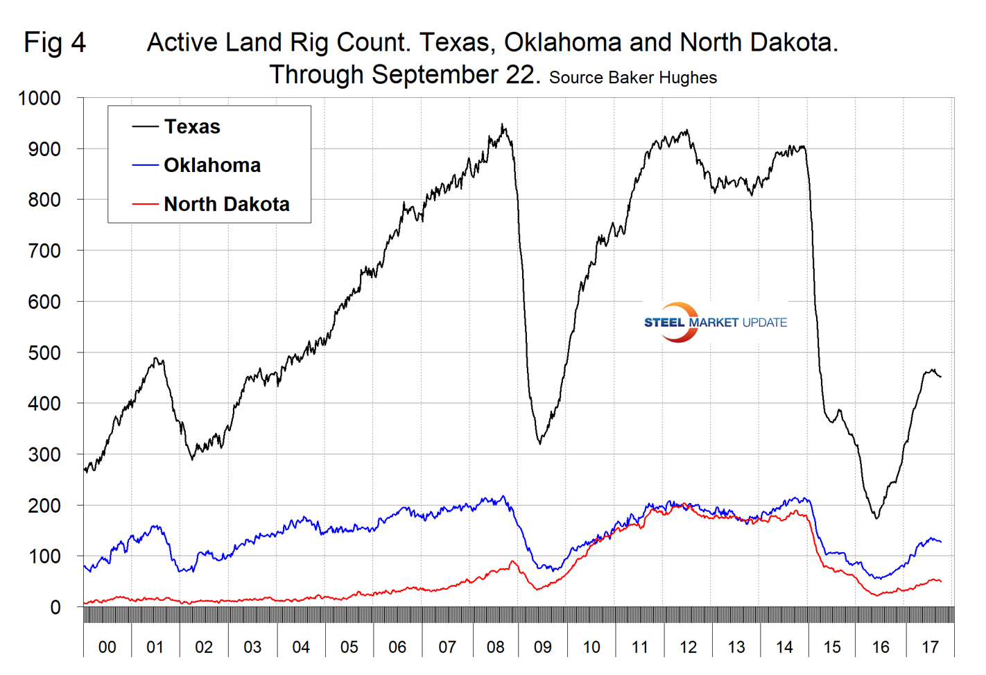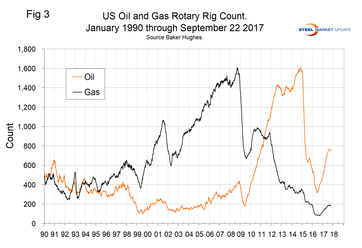 On Wednesday, Sept. 20, the price of West Texas Intermediate (WTI) rose above $50 per barrel for the first time since July 31, which was the only day greater than $50 since May 24. WTI closed at $51.86 on the 25th. The number of operating rigs exploring for both oil and gas had a recent peak of 958 on July 28 and has since declined to 935 on Sept. 22. The prices of oil and natural gas drive the consumption of energy-related steel products including oil country tubular goods, pipe fittings and well head equipment, among others. A significant volume of hot rolled coil is used to make welded tubular goods.