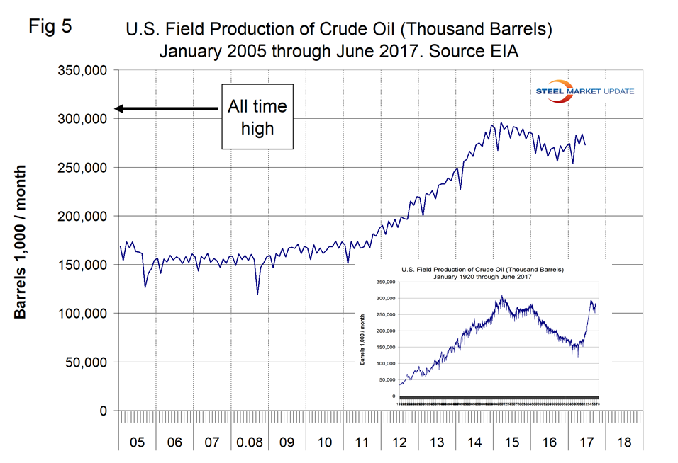 Figure 5 illustrates the U.S. oilfield production of crude oil from January 2005 through June 2017 with an inset back to January 1920. The all-time high for production was 310 million barrels in the month of October 1970. Production in June 2017 was 273 million barrels.