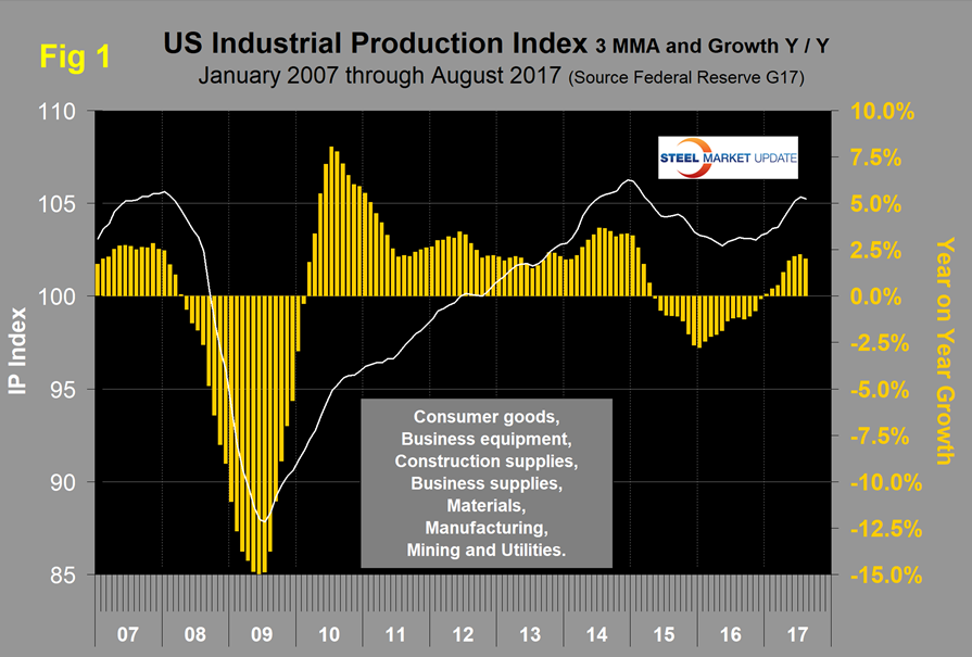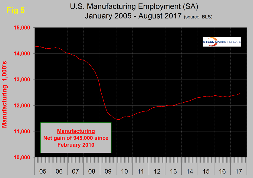 SMU Comment: The ISM index, which we give the most credence, is at its strongest level since May 2011 and signaling expansion. This is the only leading indicator examined in this update. Auto assemblies and supplier industries are slowing in NAFTA, and the U.S. and Canada are losing share to Mexico. Manufacturing has added 137,000 jobs this year through August and the employment component of the ISM index has had positive growth in each of the last 11 months. The industrial production index and new orders for durable goods have positive growth. Therefore, we conclude that the balance of these seven measures are positive signs for the balance of 2017.