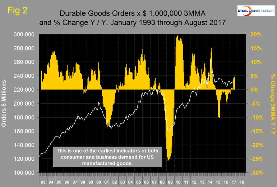 At SMU, our take on this is somewhat more positive because we think it’s necessary to look at a 3MMA year over year to get a more realistic picture.Figure 2 shows the 3MMA of monthly orders for durable goods since January 2010 with the percent change year over year. March this year was the first month since April 2015 to have positive year-over-year growth. There has been an improving trend since August 2015 with a positive surge in the most recent data for June, July and August this year.