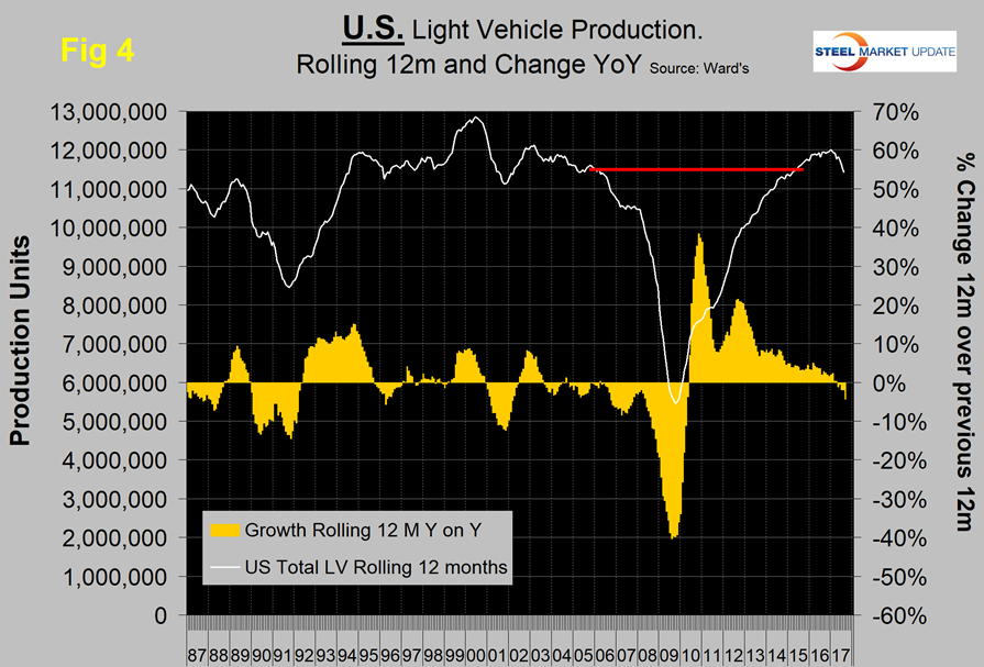 Light vehicle production in NAFTA declined by 8.3 percent in three months through August year over year with very negative momentum. Assemblies in the U.S. declined by 13.0 percent, Canada declined by 8.1 percent and Mexico expanded by 7.0 percent. Mexico has been taking share from the U.S. for over a year, also from Canada to a lesser extent. Figure 4shows light vehicle production in the U.S. on a rolling 12-month basis with the year-over-year growth rate. Growth has been negative in the U.S. every month in the period April through August this year. This data comes from Ward’s Automotive. There is a huge movement of components and sub-assemblies in both directions across the southern border, therefore it is not known whether the Ward’s data exaggerates or deflates the national differentials.