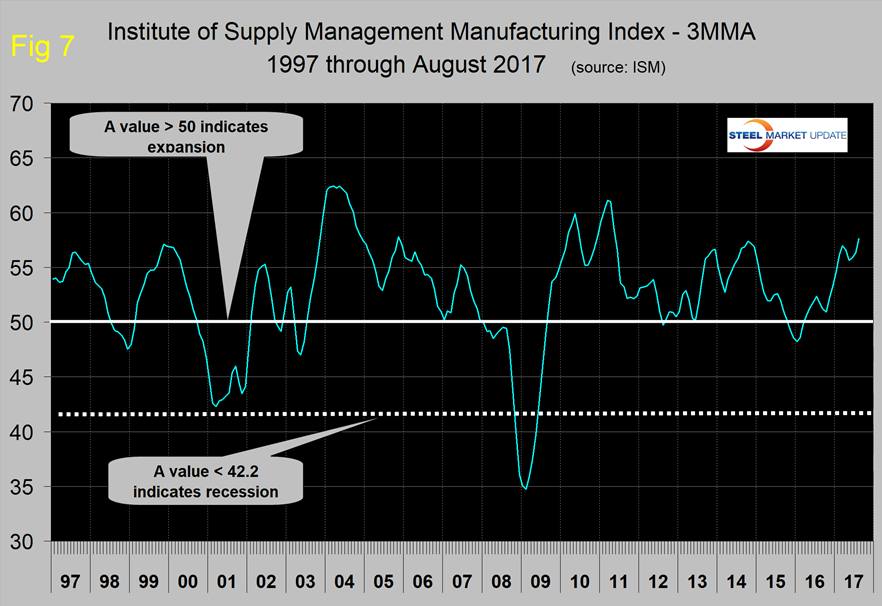 The Institute for Supply Management’s manufacturing index is a diffusion index. As ISM states, “Diffusion indexes have the properties of leading indicators and are convenient summary measures showing the prevailing direction of change and the scope of change. An index value above 50 percent indicates that the manufacturing economy is generally expanding; below 50 percent indicates that it is generally declining.” Figure 7 shows the 3MMA of the ISM index from January 1997 through August 2017 with an improving trend since January 2016. In August, the 3MMA of the index at 57.63 was the highest since May 2011.