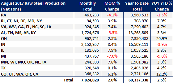 Total raw steel production for the month of August was 7,824,820 net tons, with 5,344,663 tons produced by electric arc furnaces (EAFs) and 2,480,157 tons produced by blast furnaces. This is the highest monthly production figure seen since January 2015 when 8,002,074 tons were produced. August raw steel production was 150,877 tons or 2.0 percent lower than the previous month, and 496,286 tons or 6.8 percent higher than the same month last year, reports the American Iron and Steel Institute (AISI) in Washington. AISI’s monthly estimates are different than the weekly estimates we report; the monthly estimates are based on over 75 percent of the domestic mills reporting versus only 50 percent reporting for the weekly estimates.