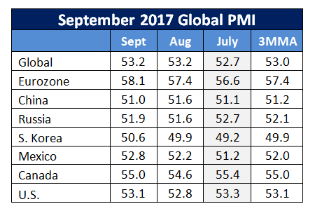 Global manufacturing stayed steady at a strong reading of 53.2 in September. The J.P. Morgan Global Manufacturing PMI was unchanged from the August reading with consumer, intermediate and investment goods all signaling expansion.