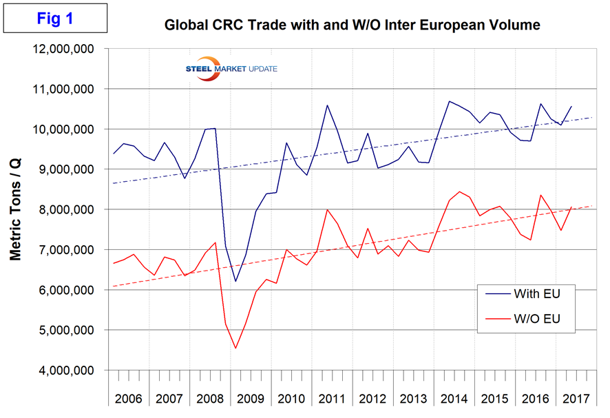 In the four quarters Q3 2016 through Q2 2017, 41,523,000 metric tons of cold rolled coil were traded internationally. Excluding the tonnage traded within the EU, the global total was 31,864,000 metric tons. In the 10 quarters since Q1 2015, the global total excluding inter EU has averaged 7.8 million metric tons, within a range of 7.2 million to 8.4 million, therefore fairly consistent. Figure 1 shows the total global tonnage quarterly since Q1 2006 both with and without the inter EU volume.