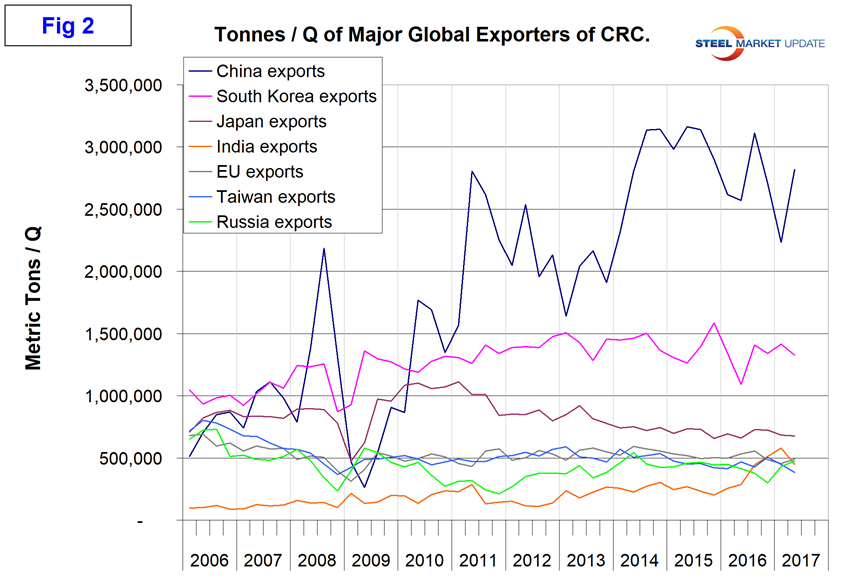 In this analysis, we use only the total excluding the inter EU trade to provide what we think is a more representative base for comparisons. The highest tonnage quarter since our data begins was Q3 2014 with a total of 8,439,000 tons. The seven major exporters in the four quarters Q3 2016 through Q2 2017 in order of volume were China, South Korea, Japan, India, the EU, Taiwan and Russia. The range was China at 10.9 million to Russia at 1.6 million. The U.S. came in a distant eighth with 800,000 metric tons. Together, the top seven accounted for 83.2 percent of total global CRC trade in the last four quarters. The main takeaway is that China lost share between Q2 2015 and Q1 2017, but bounced back in Q2 2017. India has more than doubled its export volume in the last year. Figure 2 shows the relative size of China as an exporter, and that South Korea is in second place and well ahead of the rest of the pack. China exported 11.010 million metric tons of CRC in 2016 and 5.053 million tons in the first half of 2017.