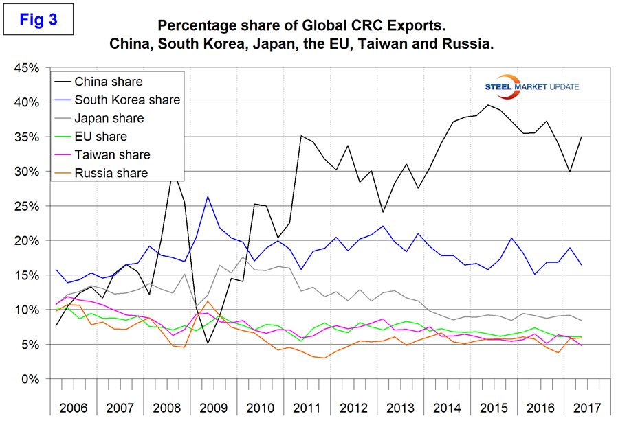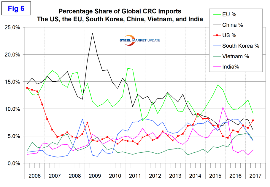 The United States imported 7.9 percent of total global CRC trade in Q2 2017, up from 6.0 percent in Q2 2016 and the highest share since Q1 2015. As China was taken out of the equation, they were replaced by other suppliers.
