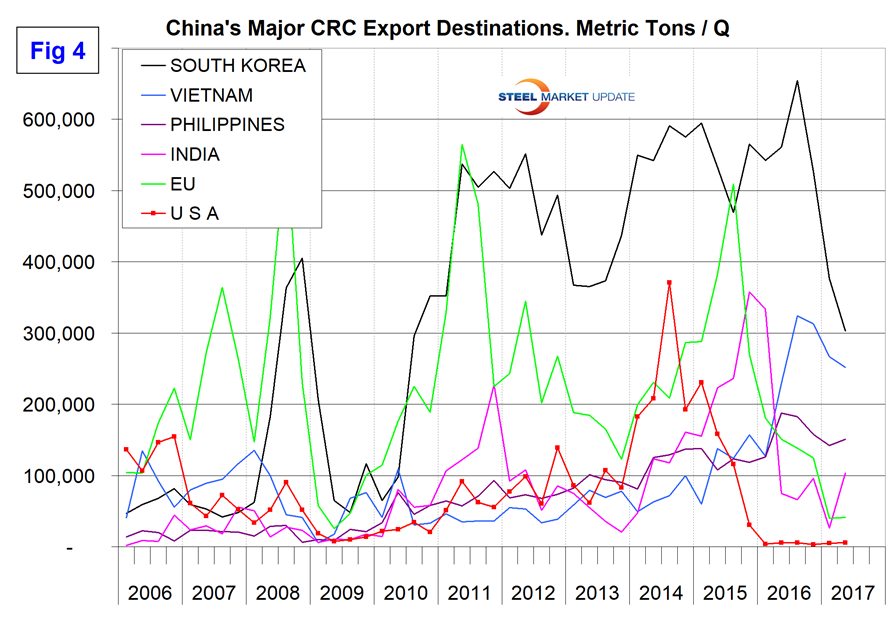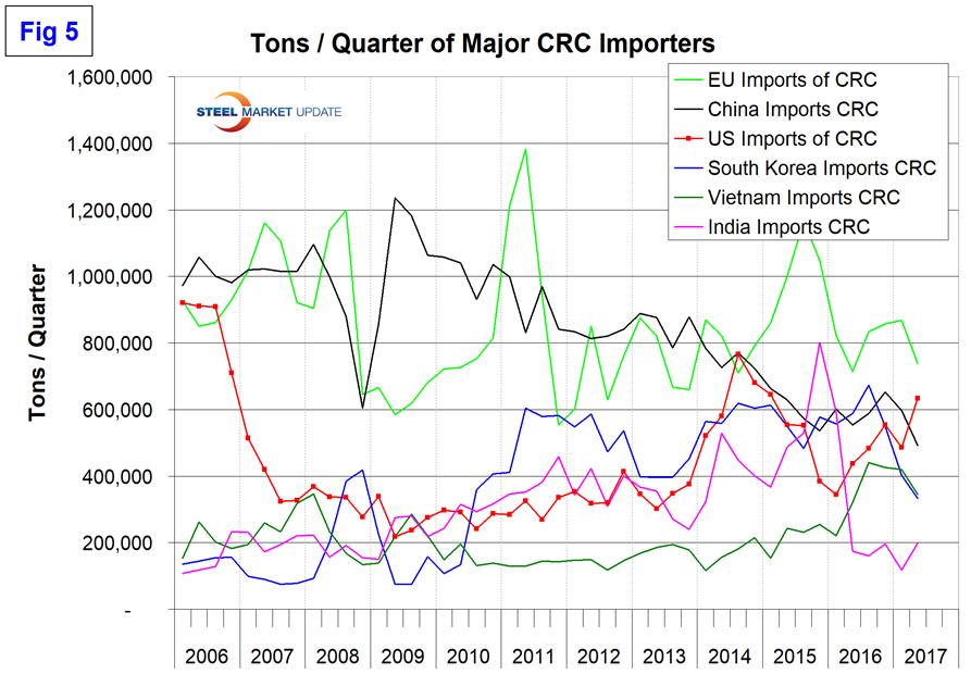 There have been dramatic changes in the destination mix of Chinese CRC exports in the last six quarters as much of the world plays defense against the Chinese onslaught. South Korea is still the largest volume destination for China’s exports as shown in Figure 4, but the volume has been cut in half in the last year. India, the EU and the U.S. have successfully achieved major reductions in Chinese volume. Vietnam has expanded rapidly and is in second place. China’s exports of CRC to the U.S. declined from 536,000 tons in 2015 to 18,000 in 2016 and to 11,000 tons in the first half of 2017.