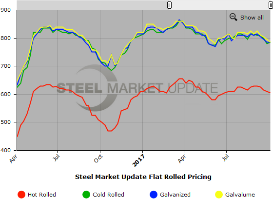 SMU Note: Below is a graphic showing our hot rolled, cold rolled, galvanized, and Galvalume price history. We are in the process of adding prices to this graph. To use the graph’s interactive capabilities, you must view it on our website here. If you need help navigating the website or need to know your login information, contact us at info@SteelMarketUpdate.com or by calling 800-432-3475.