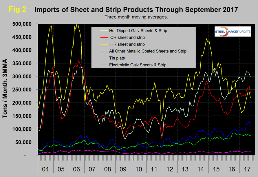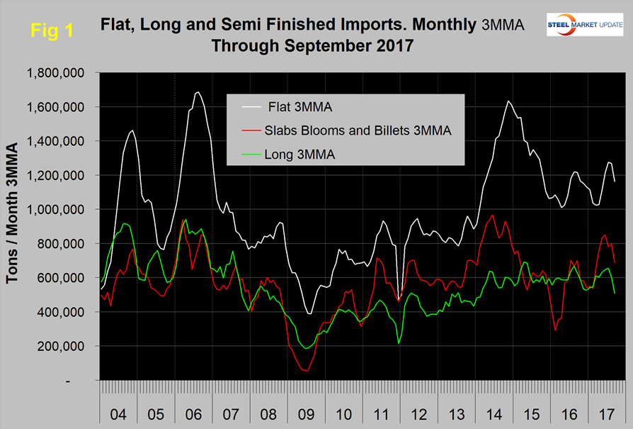 Figure 1 shows the 3MMA through September licensed tons of semi-finished, flat and long products since January 2004. Imports of semi-finished in September had a 3MMA of 686,814 tons, which was down by 1.8 percent year over year. “Flat” includes all hot and cold rolled sheet and strip, plus all coated sheet products, plus both discrete and coiled plate. The 3MMA of flat rolled imports was 1,162,775 tons in September, which was down by 4.3 percent year over year. Long product imports were range bound between 519,000 tons and 772,000 tons between September 2014 and August 2017 with no particular trend evident. In September 2017, long product imports broke out of the range to the downside with a volume of 508,459 tons.