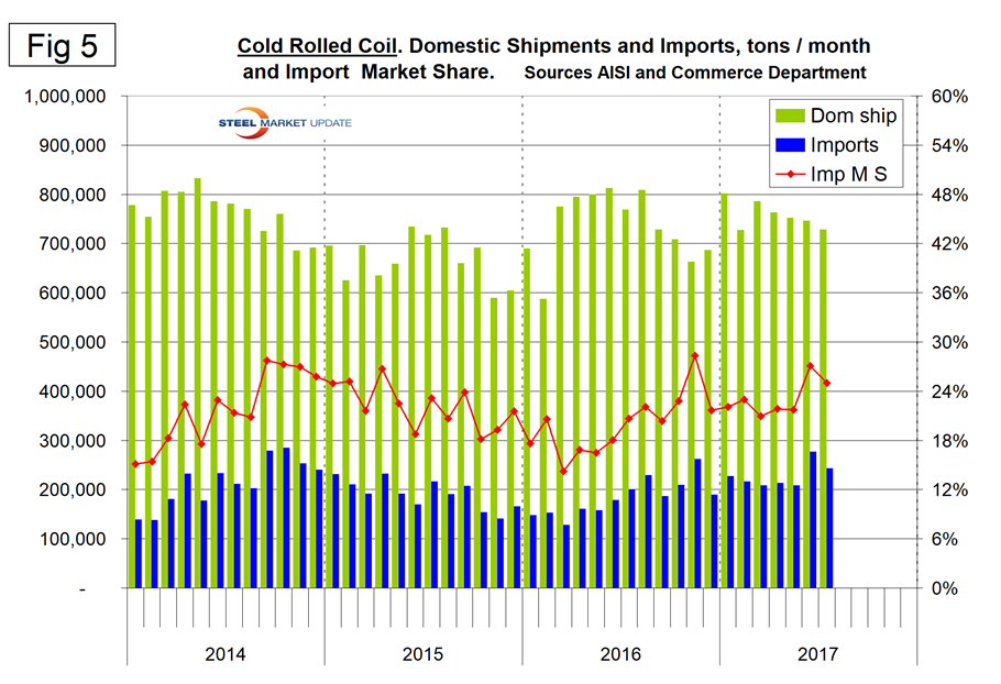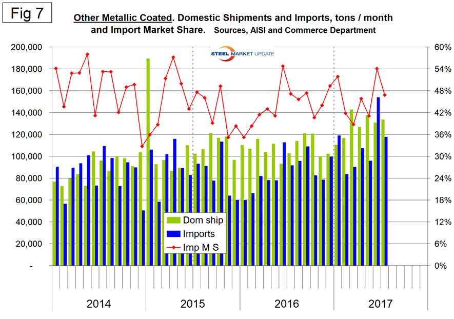 Figure 3 shows the import market share of sheet and long products through July, which is the latest data available. The import market share of sheet products peaked at 24.3 percent in March 2015. The July 2017 level was 21.8 percent. Long product import market share has been considerably higher than for sheet products since early 2015 and in July was 28.5 percent, the highest since May 2015.