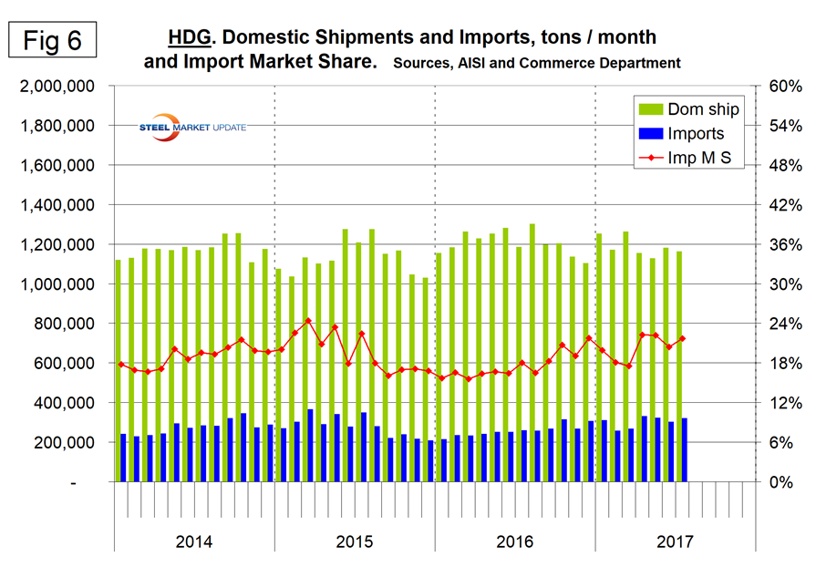 Table 1 provides an analysis of major product groups and of sheet products in detail. It compares the average monthly tonnage in the three months through September 2017 with both three months through June (3M/3M) and the three months through September 2016 (Y/Y). All sheet products except hot rolled were down in the three-month comparison. On a year-over-year comparison, hot rolled was down by 23.2 percent and HDG was up by 13.6 percent. The other sheet products fell between those two extremes. Plate was down by 21.9 percent year over year, but tubulars were up by 124.9 percent.