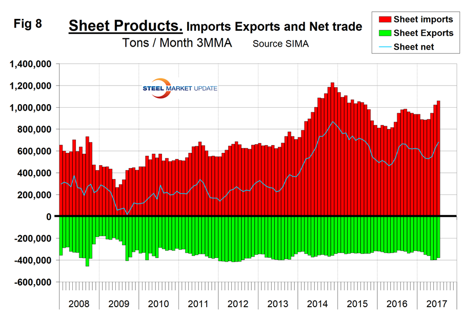 Net imports equals imports minus exports; our analysis is based on the final volumes through July. We regard this as an important look at the overall trade picture and its effect on demand at the mill level. Figure 8 shows net sheet product imports on a 3MMA basis to be 682,816 tons in July, which was the highest since September 2015. Exports have increased in 2017 driven by the depreciation of the U.S. dollar on the international foreign exchange markets. Net sheet steel imports are high by historical standards.