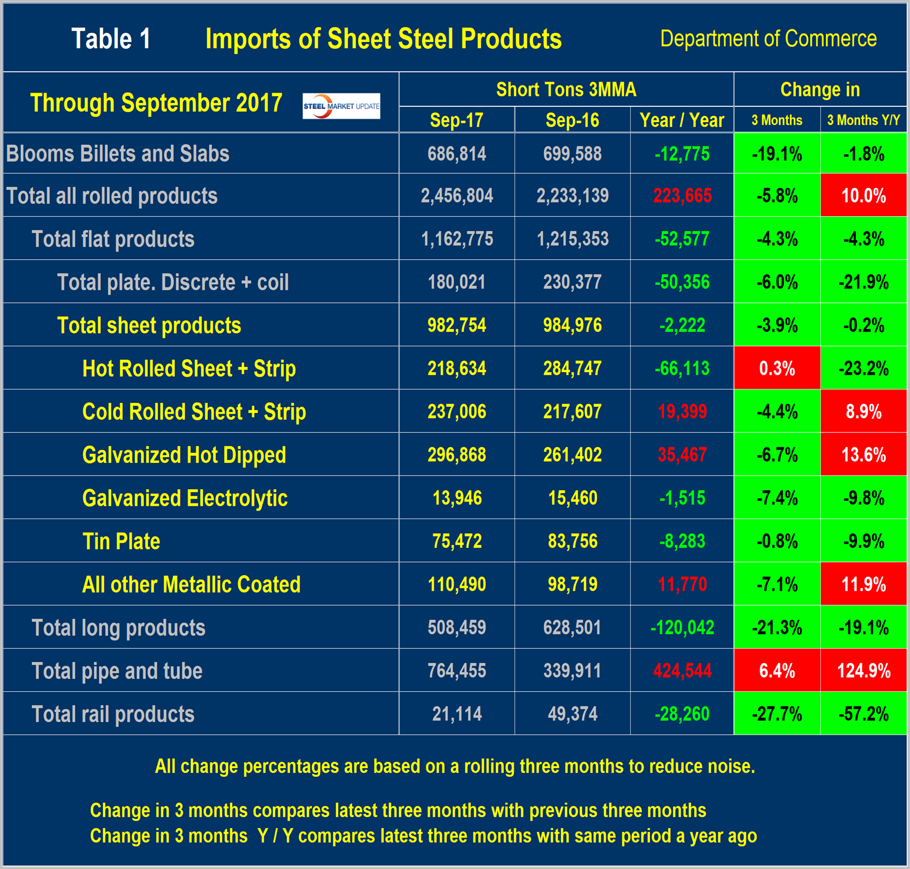 Total rolled steel imports declined by 5.8 percent in the three months through September, compared with the three months through June. Sheet product imports were down by 3.9 percent on the same basis.