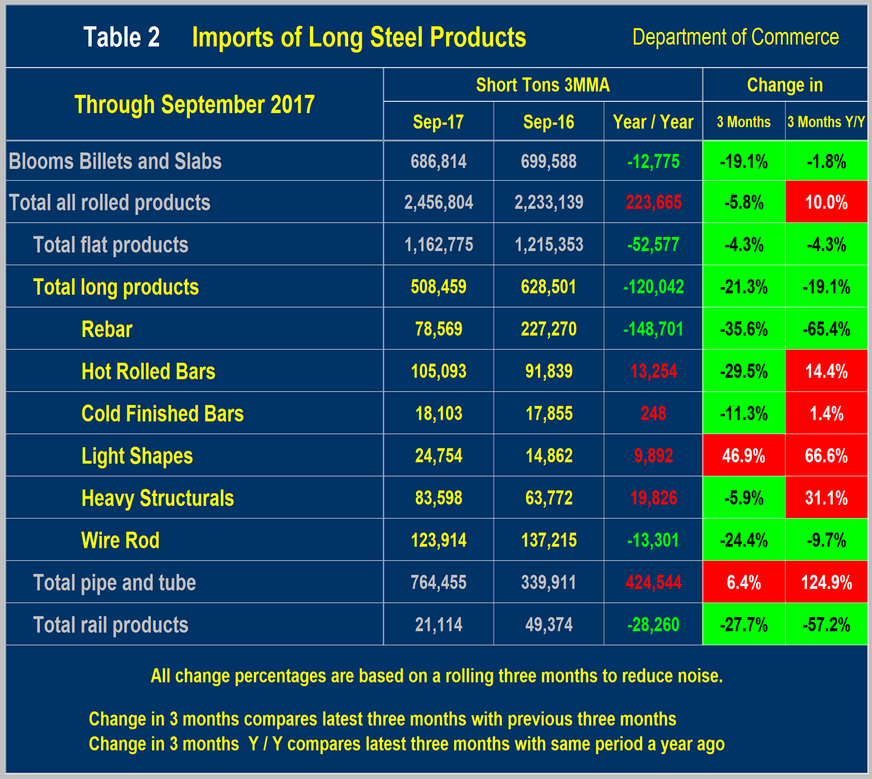 The final license data for September was reported by of the U.S. Commerce Department on Oct. 3. The data is reported within the Steel Import Monitoring and Analysis system (SIMA). An explanation of the methodology used to analyze the trade data is given at the end of this piece, together with notes describing SIMA. All volumes in this analysis are reported in short tons. We prefer not to dwell on single-month results because of the extreme variability that can occur in individual products. In the comments below, we use three-month moving averages to give what we believe is the most accurate picture.
