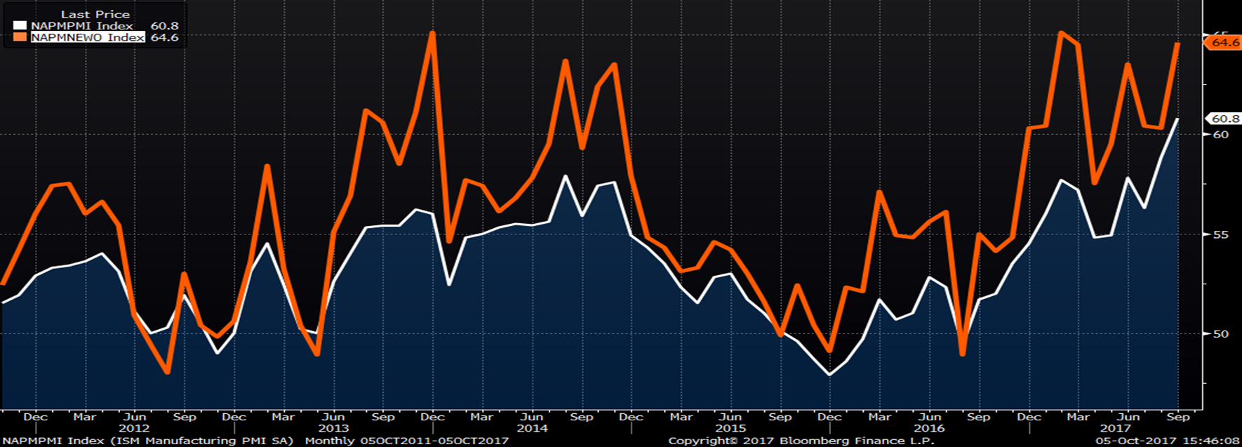 ISM Manufacturing PMI (white) and ISM Manufacturing New Orders Subindex (orange)