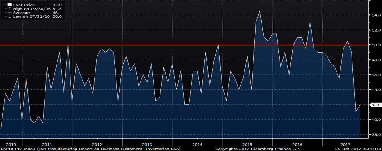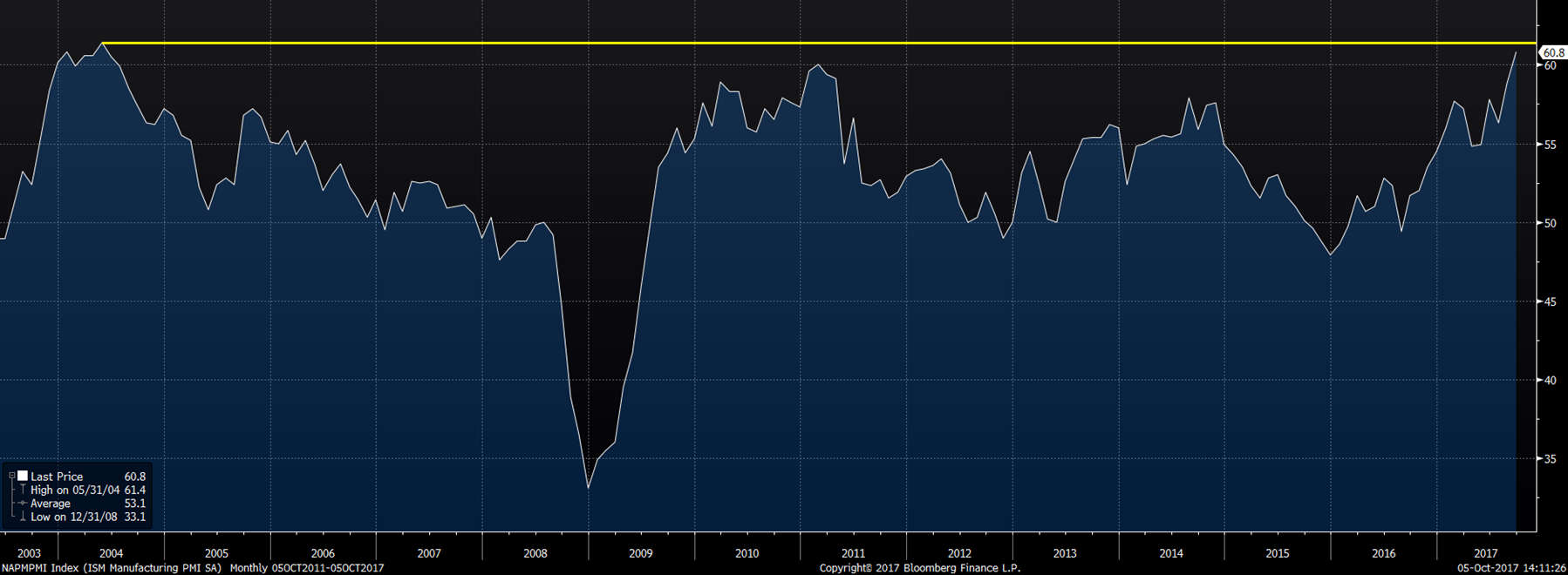 Supply looks to be contracting in the coming months with customers’ inventory at depleted levels. On the demand front, you have the ISM Manufacturing PMI at 60.8, the highest level since May 2004, while the ISM Manufacturing PMI new orders subindex is up to a very healthy 64.6.