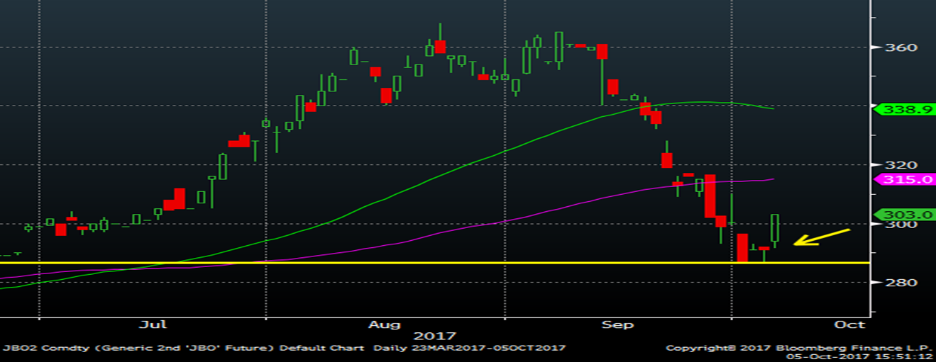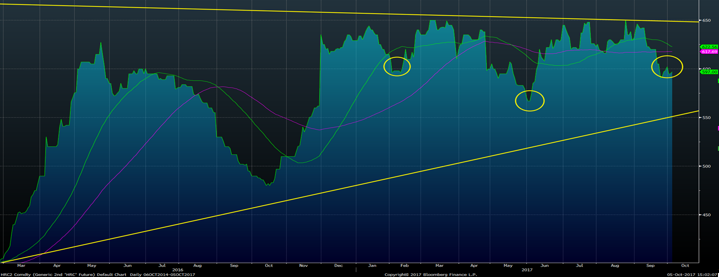 For now, the October CME Midwest HRC future has found support just above the long-term uptrend line.