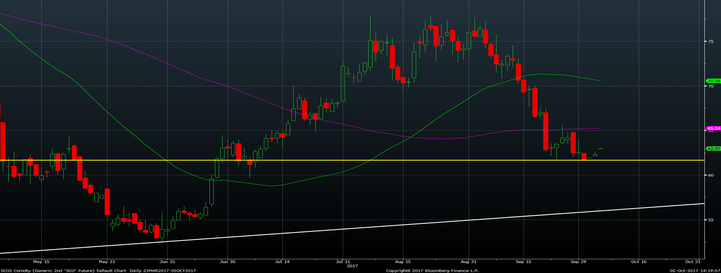The chart below of November SGX iron ore futures is showing a similar pattern as that of scrap. However, iron ore futures trading has ground to a halt this week as China is celebrating its week long Golden Week Holiday. Watch the $62 level to see if it holds. However, if these levels in scrap and ore don’t hold, next stop is the uptrend lines and then look out below if those don’t hold.