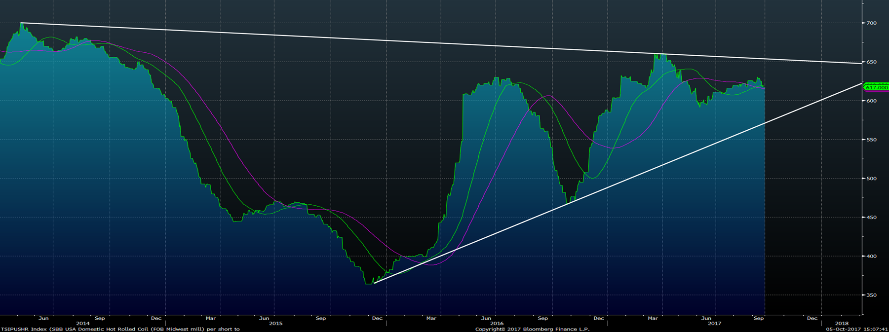 This chart is the TSI Daily Midwest HRC Index back to 2014. The pattern here is called a “triangle.” There is a long-term downtrend from the index topping out at $700 in May 2014 and the shorter long-term uptrend starting at $365 in December 2015 creating a “triangle.” Typically, when prices form a “triangle,” volatility compresses as prices trade into the apex until prices break above or below one of the trend lines. After the break, there tends to be a major move that follows. So this is telling us to watch for some major volatility to come sometime in the next few months.